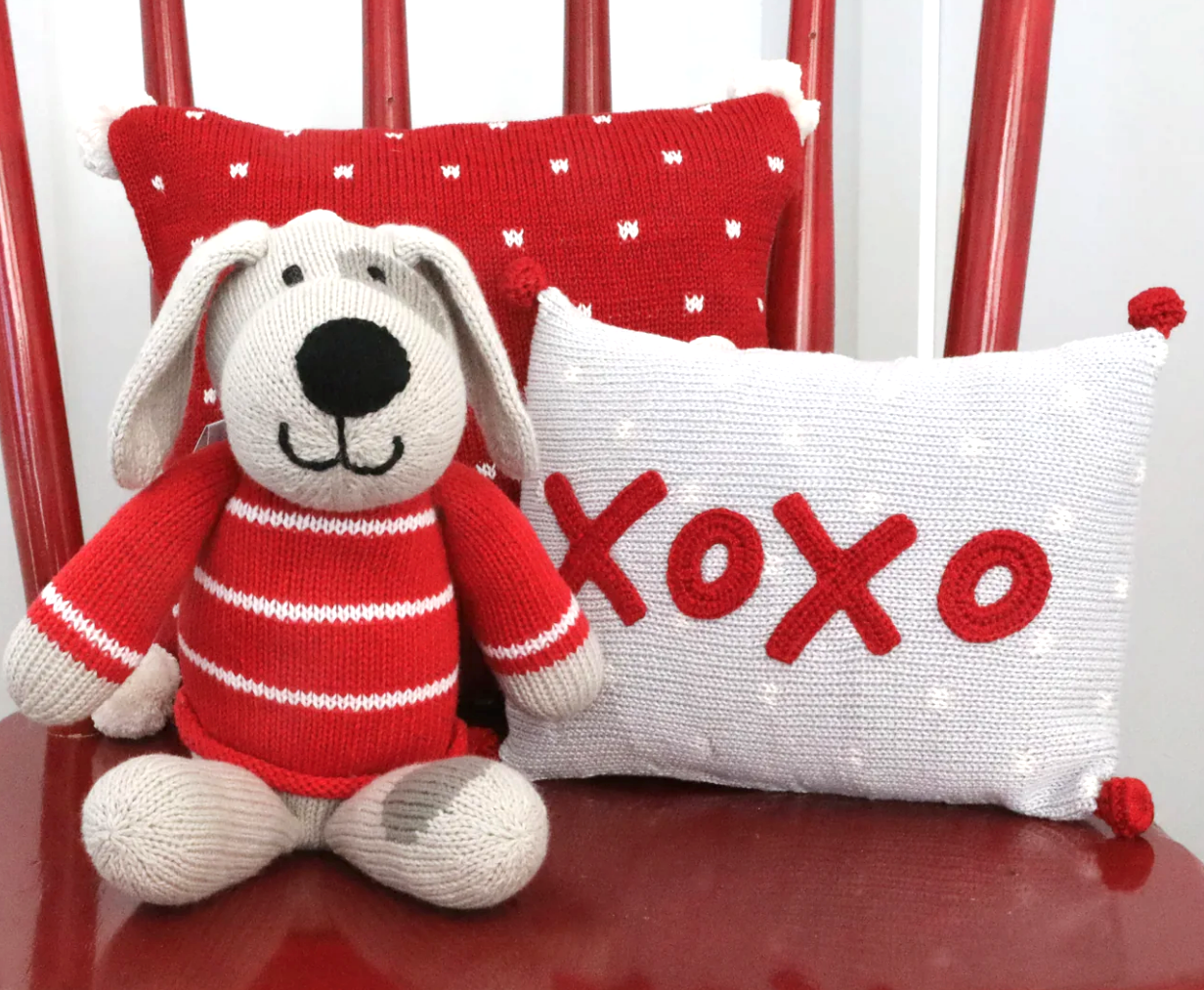 A sweet hand-knit puppy with an adorable embroidered face and cozy red sweater. Soft, cuddly, and crafted with care in Peru using fair trade practices. Perfect for a Valentine's present and snuggles and playtime! Pair with our XOXO Pillow!