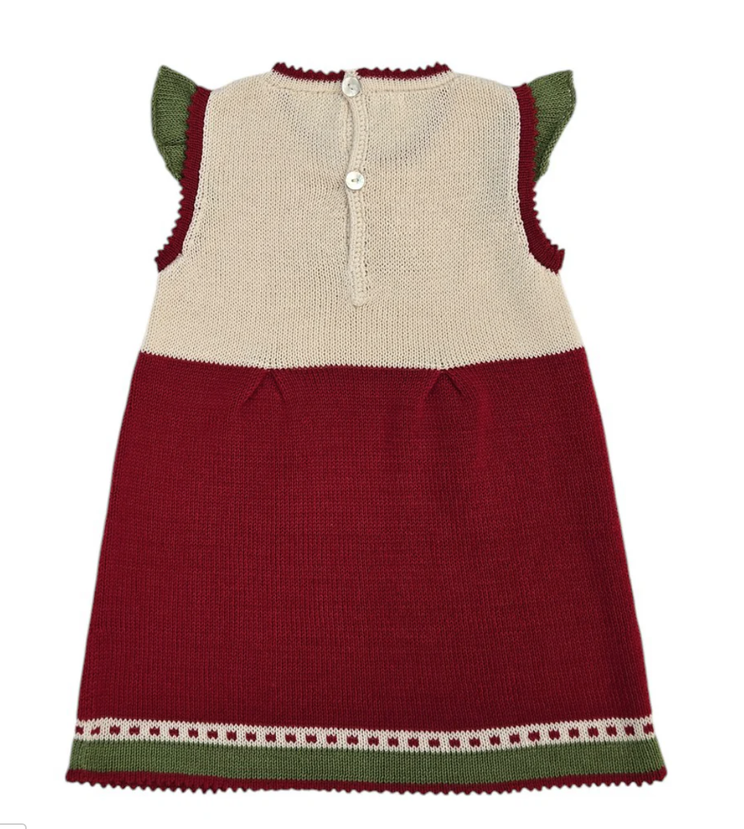 Get ready for holiday cuteness overload! This hand-knit dress features an adorable pup decked out in a pompom hat and scarf, set against a sweet cream-and-red color-block design. Fluttery green sleeves add an extra pop of seasonal cheer. Lovingly crafted by hand, it's the ultimate festive outfit for little ones ready to spread Christmas joy.