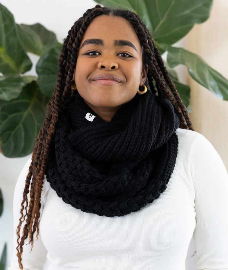 This Handmade scarf, handcrafted in Uganda, features a unique double knit pattern and is made of recycled acrylic. It is a timeless accessory that will keep you warm and stylish during the cooler seasons. Enhance your look with this thick, cozy infinity scarf.