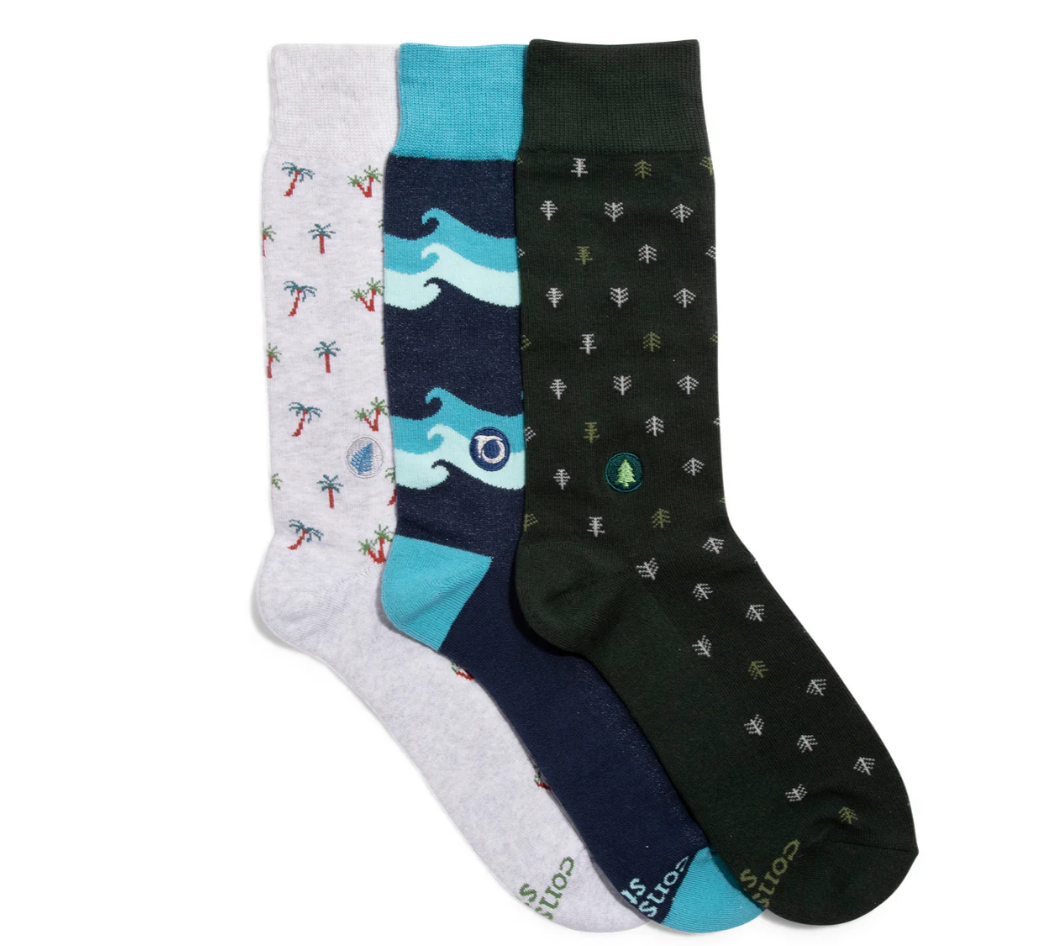 Tiny package, massive mission. This gift box brings together three environmental powerhouses—protecting our oceans, saving rainforests, and planting new forests. With designs celebrating waves, palms, and pines, every pair funds real climate action through Oceana, Trees for the Future, and Conservation International.