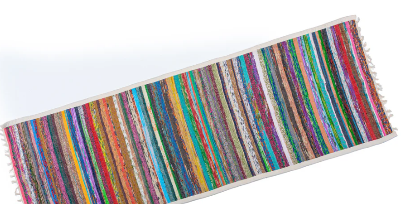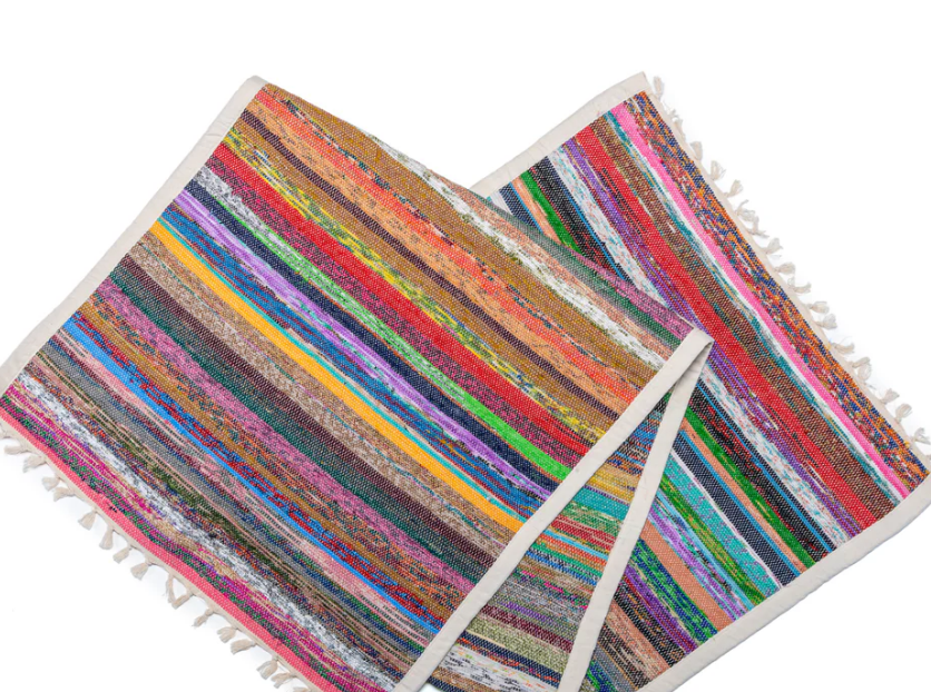 Meet your mat's new best friend. This upcycled sari yoga rug works beautifully across every setting—studio flows, outdoor adventures, even sandy beach sessions. Layer it under your mat to banish slipping on tricky surfaces like hardwood, laminate, and tile, giving you the grip and confidence to nail every pose. Woven from rescued cotton and vibrant silk sari scraps, it's a playful way to practice with purpose. Sustainable style that actually performs.