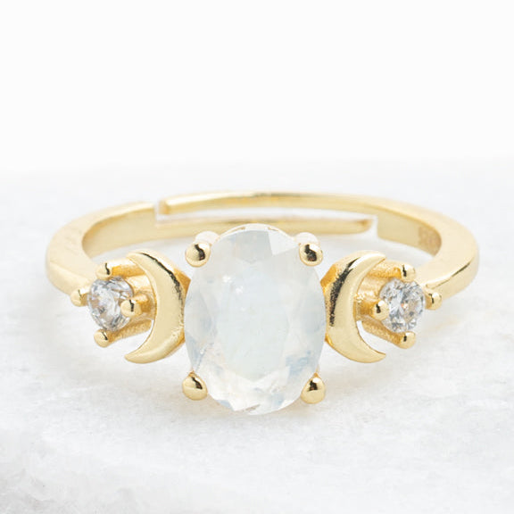 Moonstone ring with celestial detailing and an adjustable band for versatile sizing. This piece embodies hope and resilience, serving as a personal talisman or thoughtful gift. A refined accessory that connects the wearer to themes of inner light and renewal.