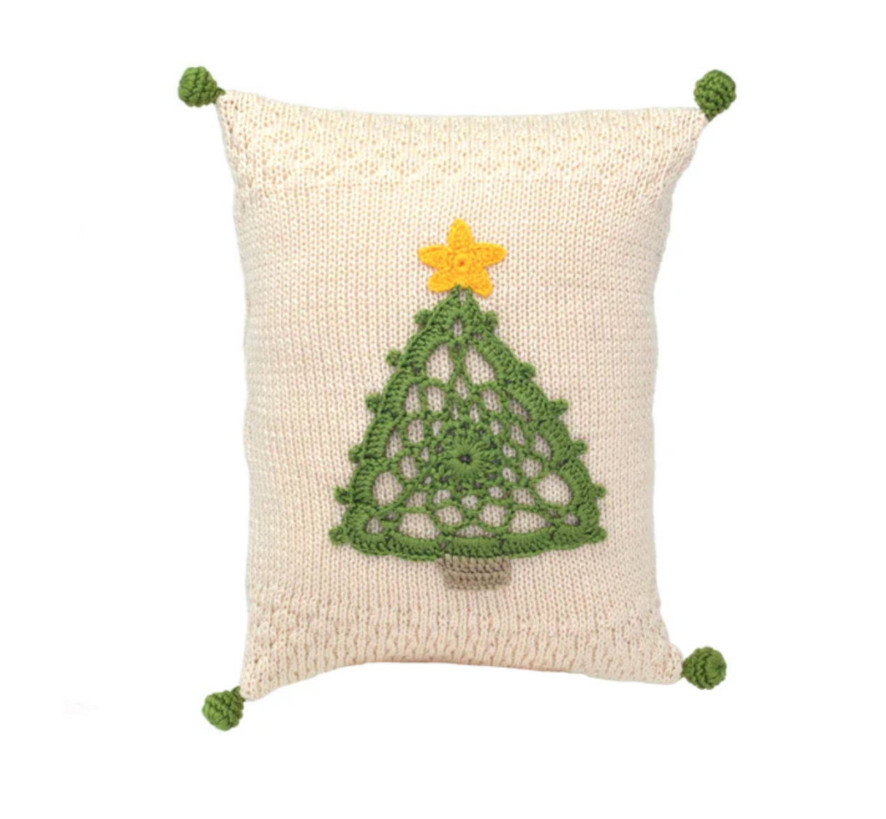 Bring holiday magic home with this hand-knit mini pillow! Crafted fair trade from Armenia, it showcases a delightful crocheted Christmas tree with a golden star and pom-pom accents. Soft cotton yarn and petite size make it perfect for adding festive warmth to any corner of your home.