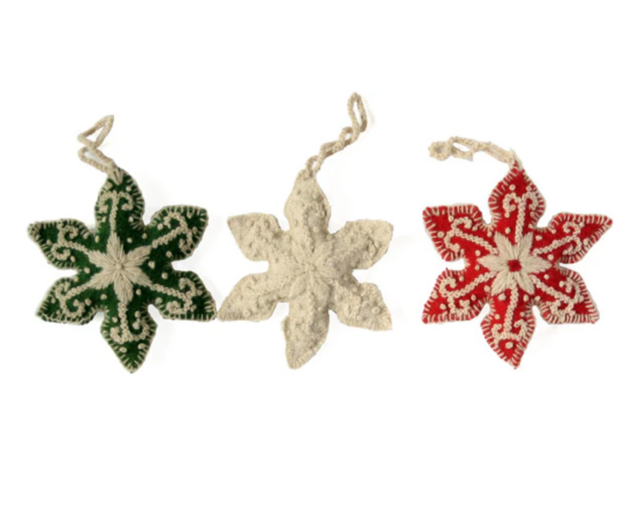 Set of 3 Hand Sewn and Embroidered Snowflake ornaments, Fair Trade, Peru