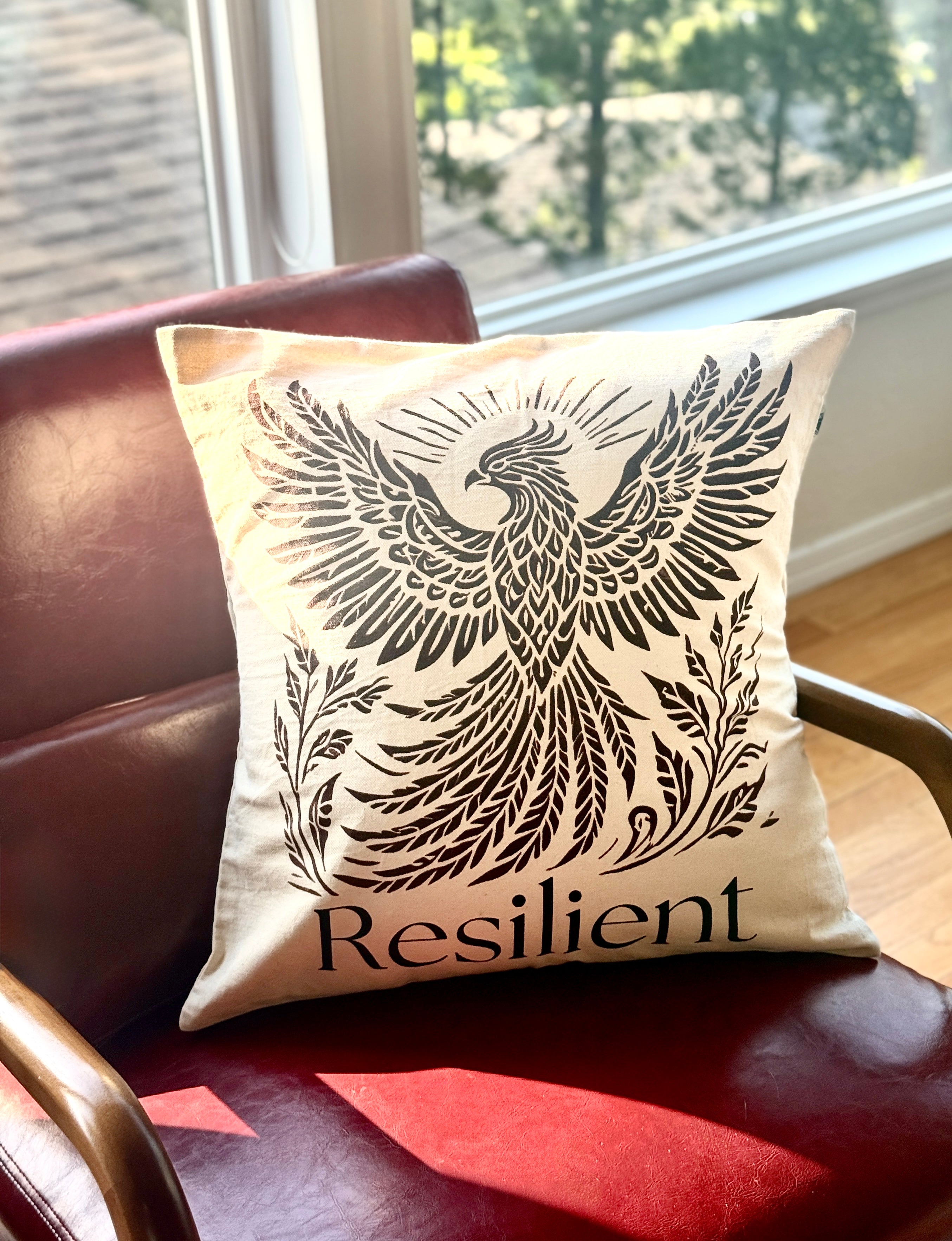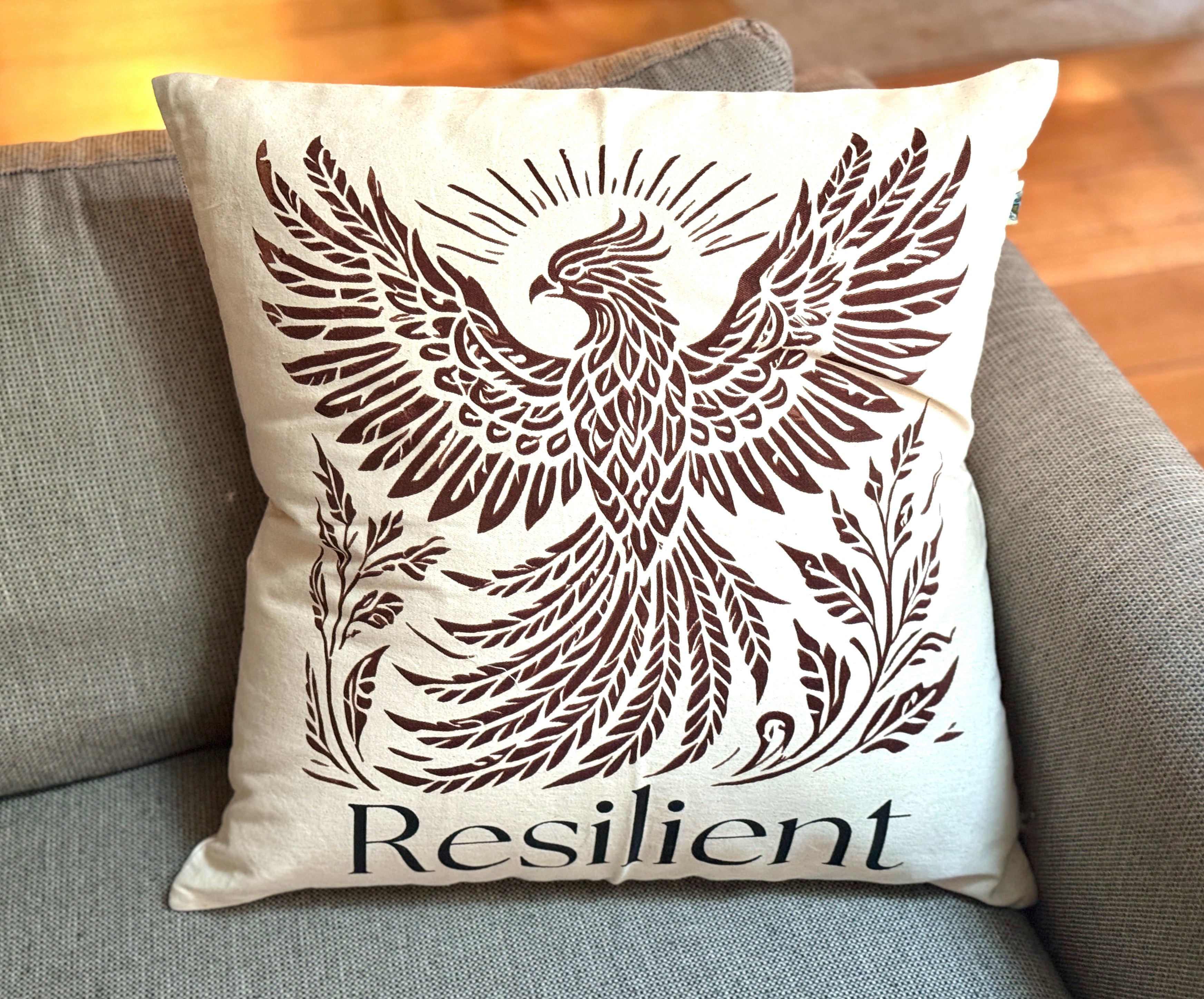 – Design: “Resilient” phoenix motif, hand-screen-printed