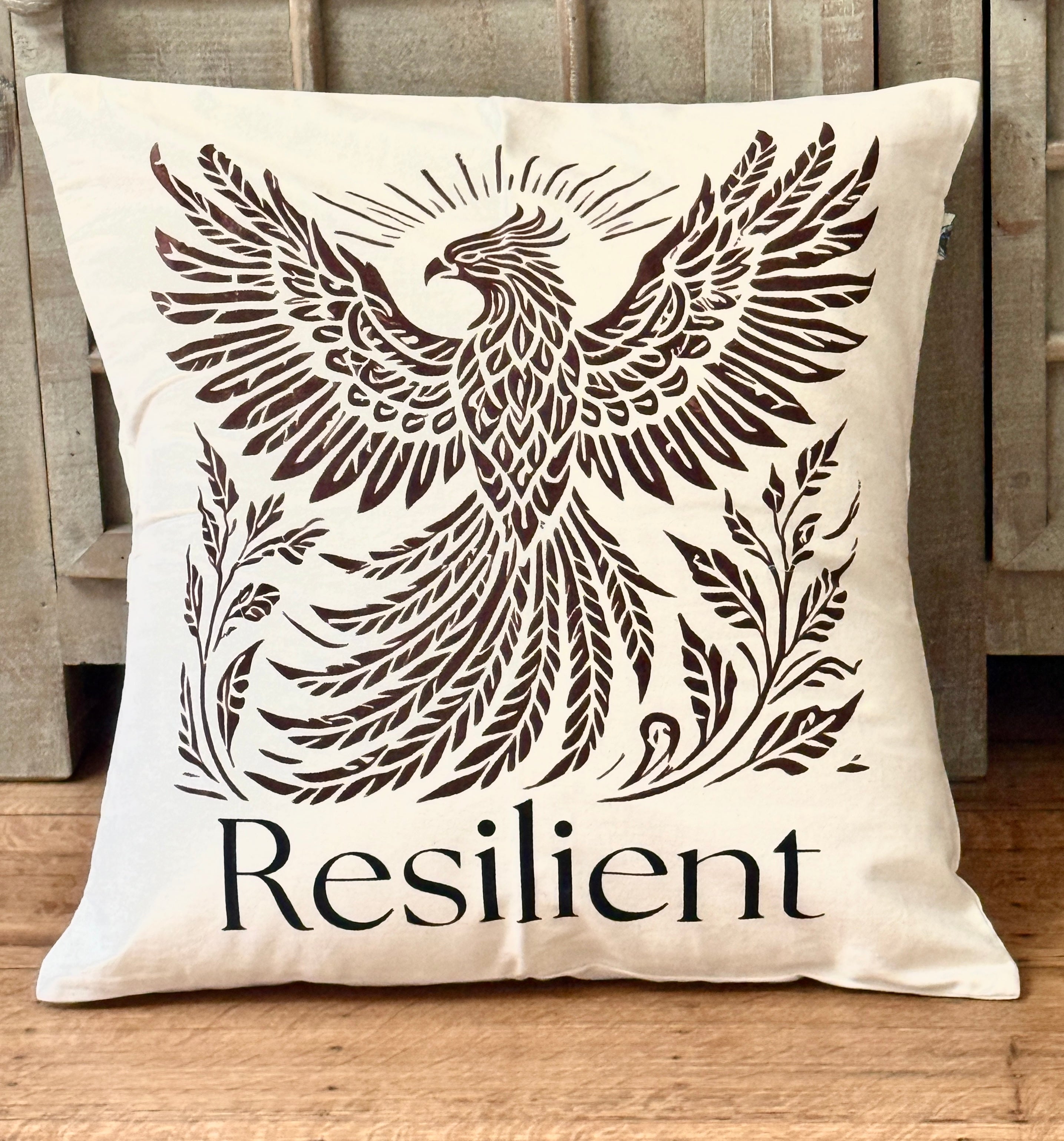 This boho-style pillow features a powerful hand-screen printed phoenix in full flight, a universal symbol of rebirth that reminds us we can rise from the ashes—stronger, wiser, and more radiant. Its soaring wings embody transformation through adversity, inspiring hope, resilience, and the courage to begin anew.