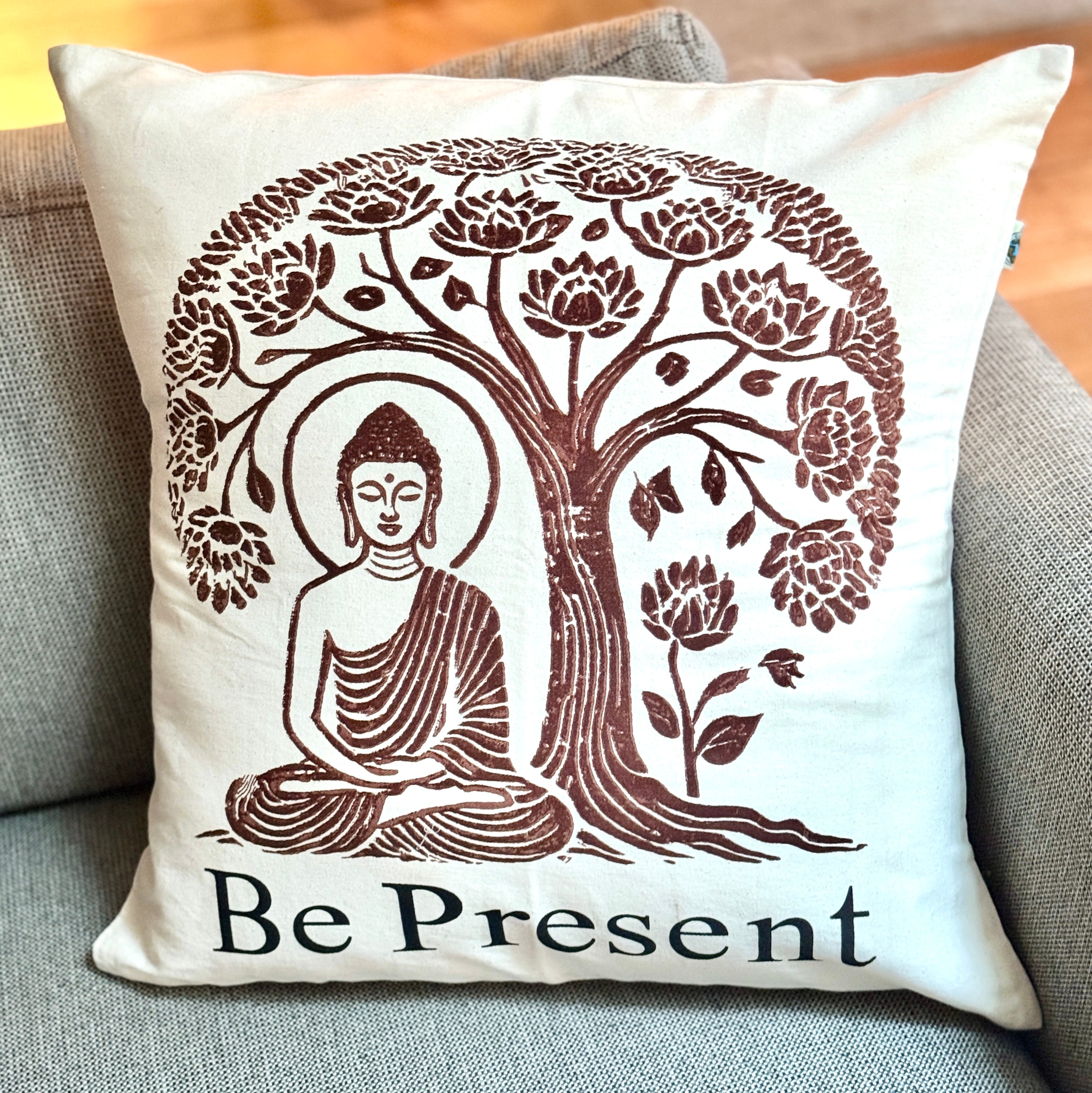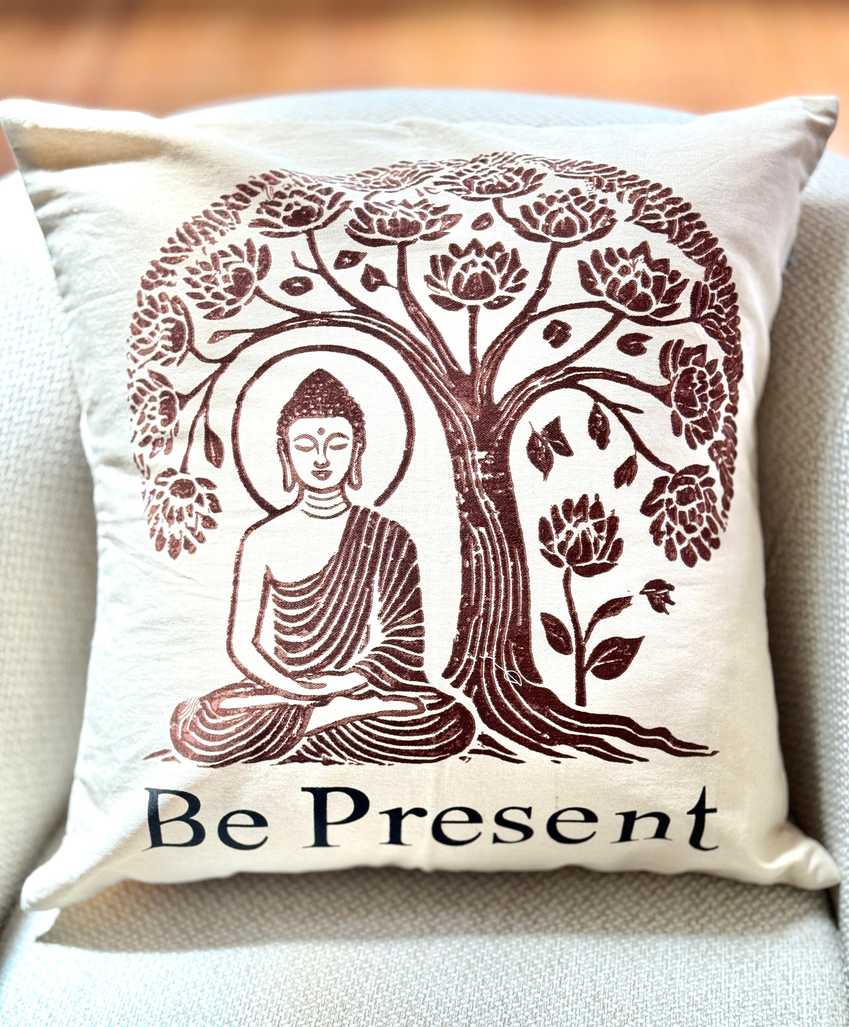 – Design: “Be Present” Buddha seated under the Bodhi tree, hand-screen-printed