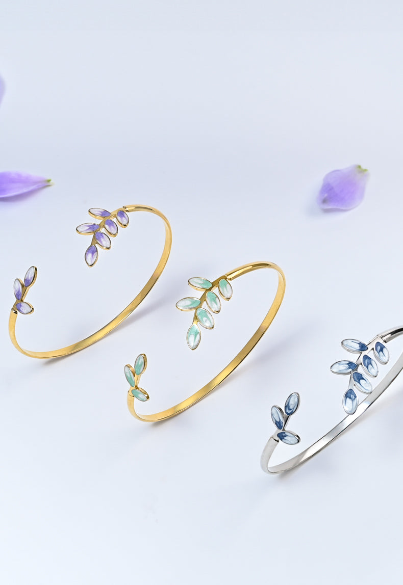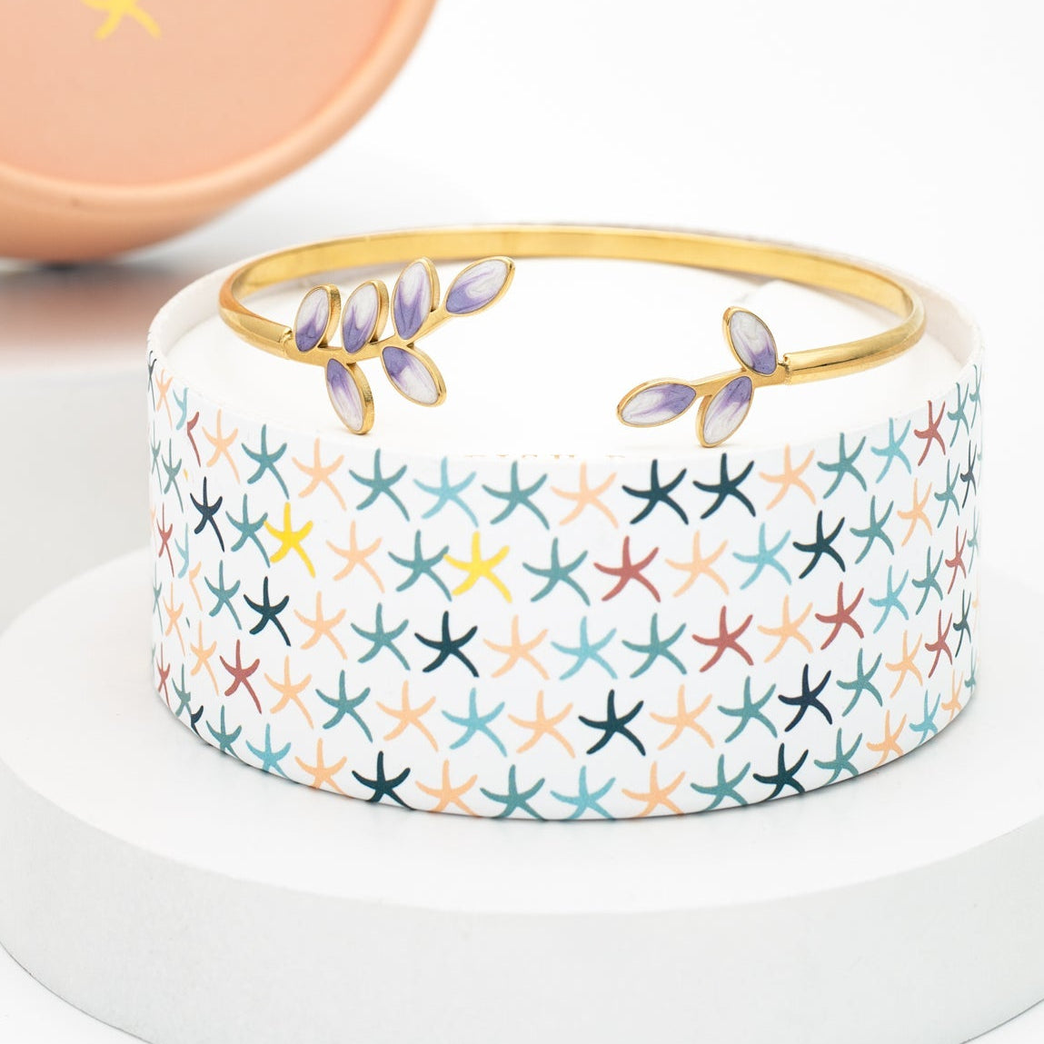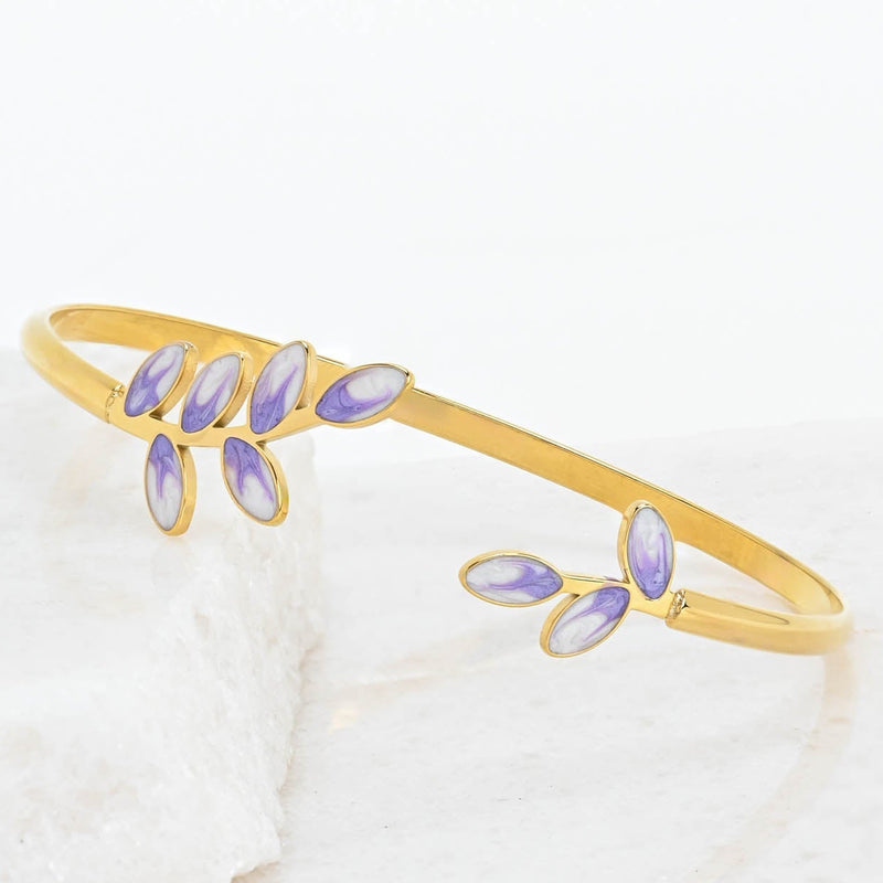 The Hope Cuff bracelet celebrates connection and resilience with soft lavender enamel and two leaves meeting at the center—symbolizing growth and hope. Its open cuff design adjusts comfortably to any wrist. A meaningful reminder that every purchase supports women artisans building brighter futures through vocational training, safe housing, and economic independence.
